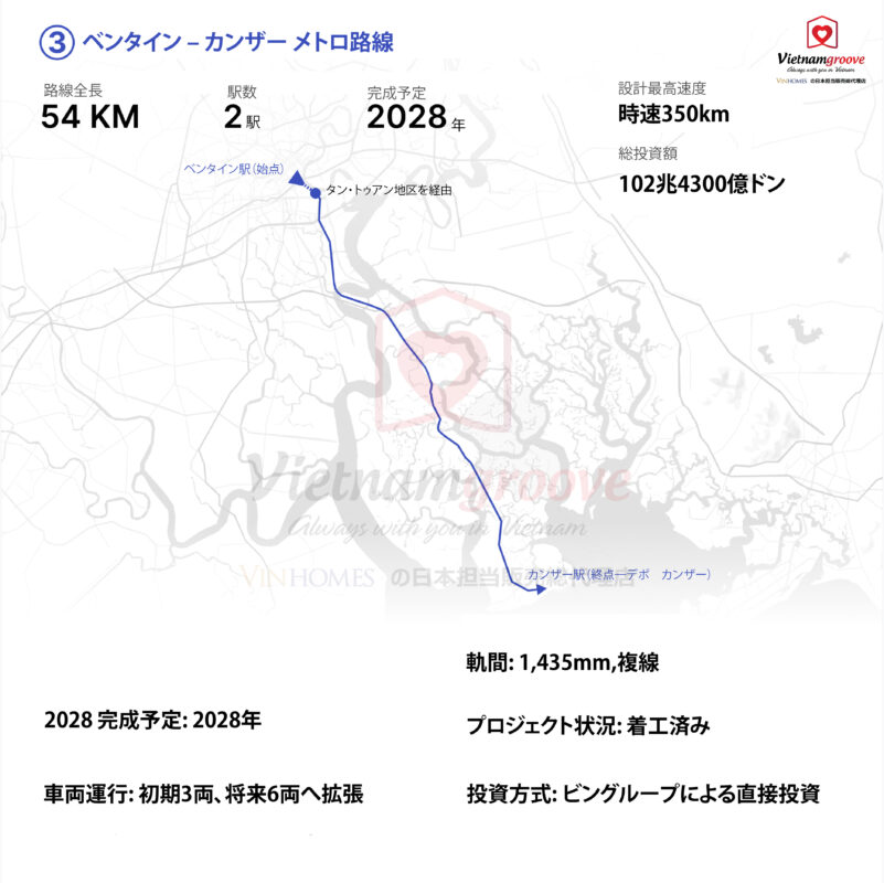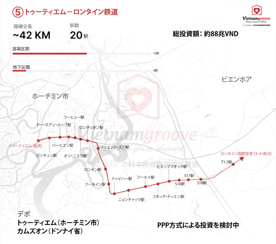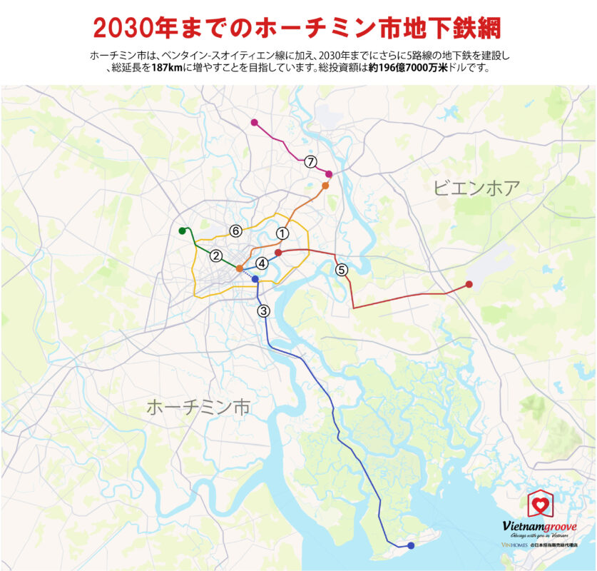 ホーチミン市は、ベンタイン-スオイティエン線に加え、2030年までにさらに5路線の地下鉄を建設し、総延長を187kmに増やすことを目指しています。総投資額は約196億7000万米ドルです。