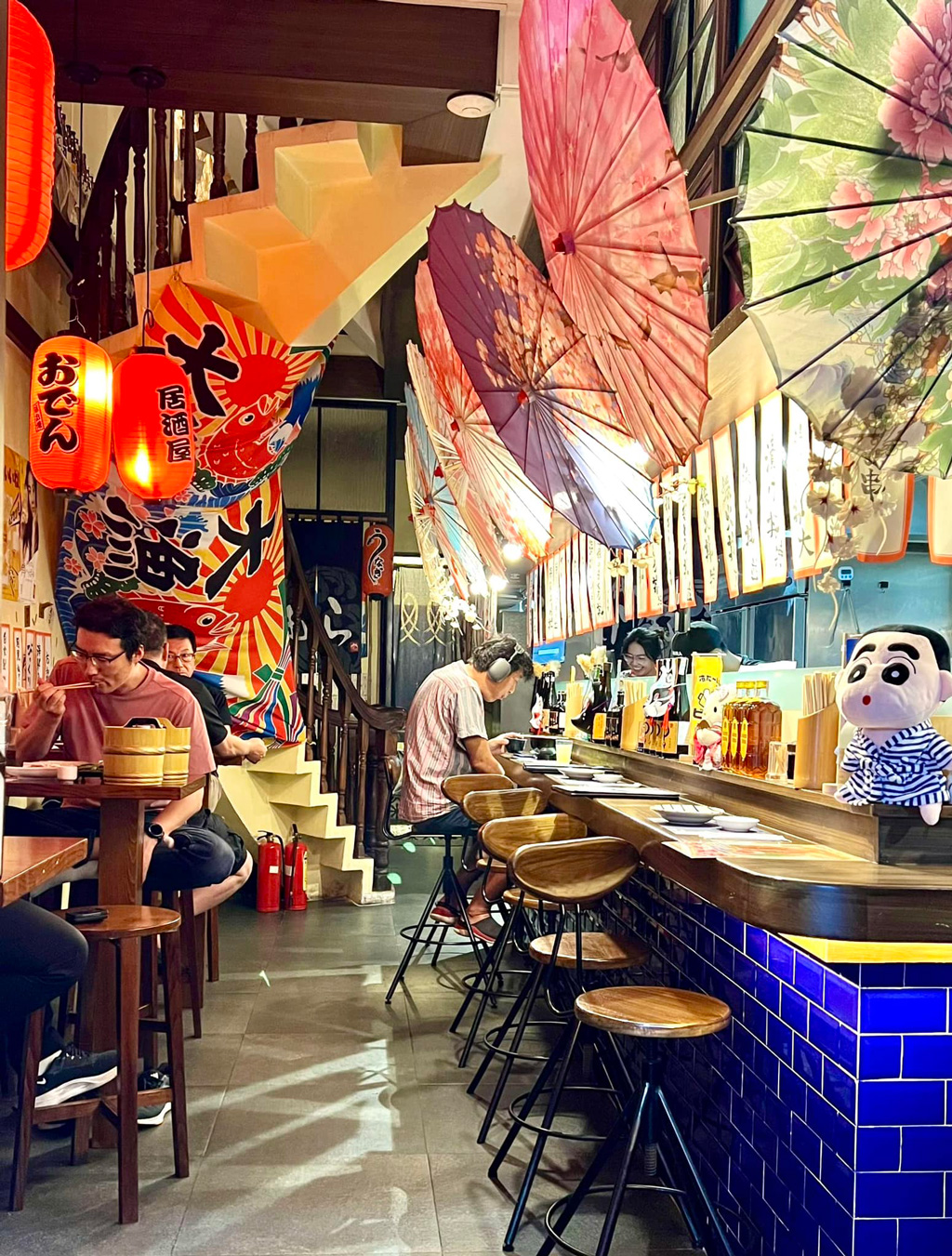 このエリアに一歩足を踏み入れた瞬間、あなたは時空を超えて日本のどこかの繁華街の路地裏にいるかのような錯覚に陥るでしょう。道の両脇には、日本語の看板がネオンを輝かせ、赤い提灯が温かい光で通りを照らします。風格のある木の扉の向こうからは、楽しそうな話し声と笑い声が漏れ聞こえ、食欲をそそる出汁や炭火の香りが漂ってきます。