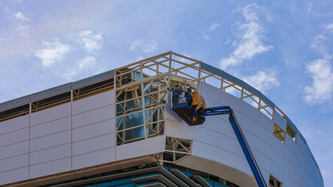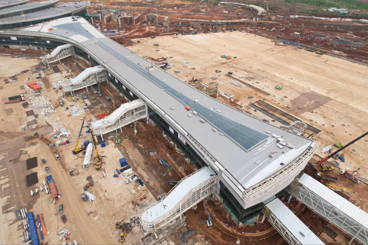 作業員たちは、ロンタイン空港旅客ターミナルのウィングの一つの仕上げ作業を進めている。