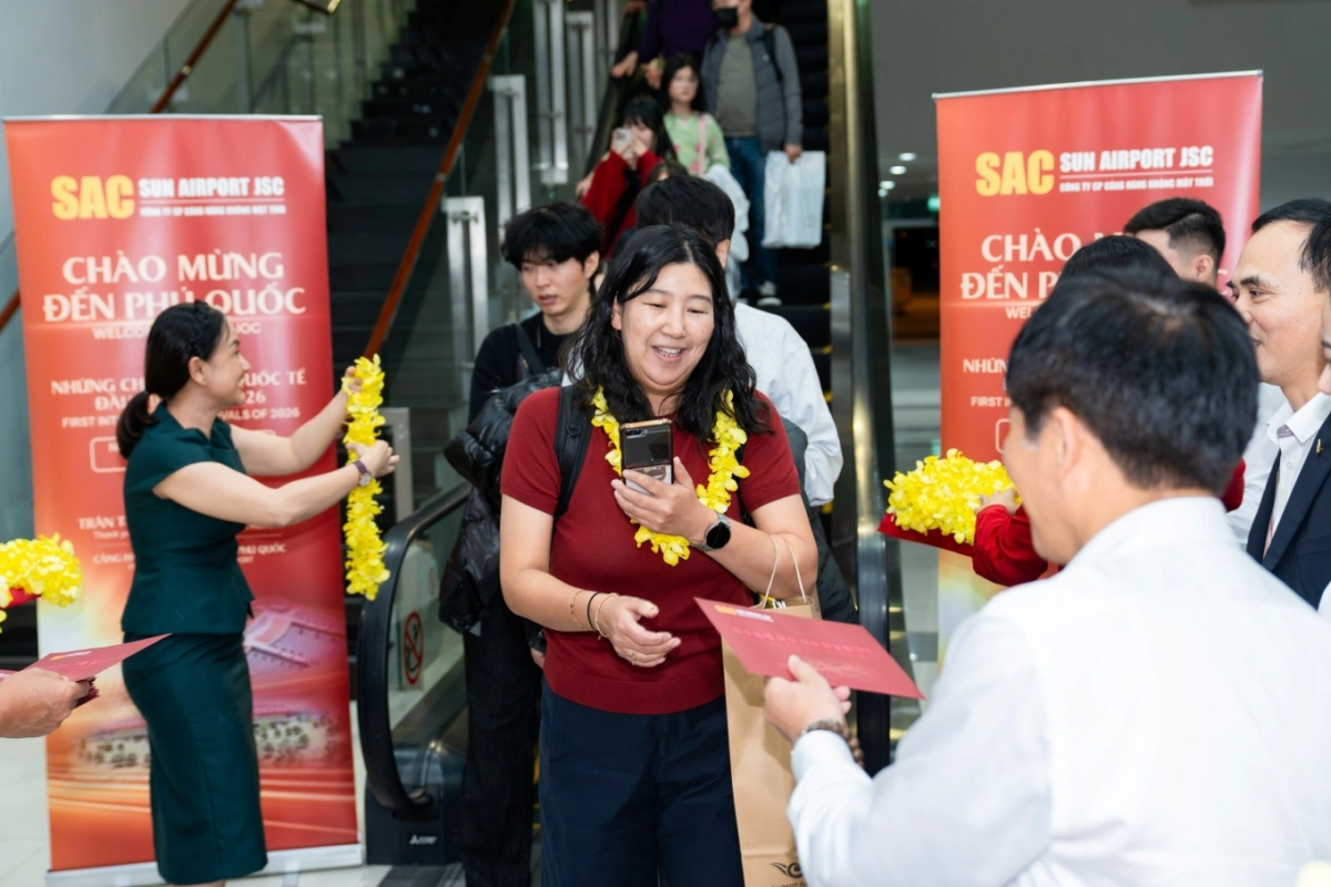 2026年1月1日朝、フーコック国際空港で歓迎を受ける韓国人観光客の一団。写真:SG