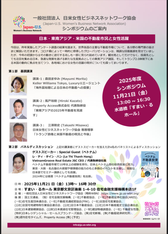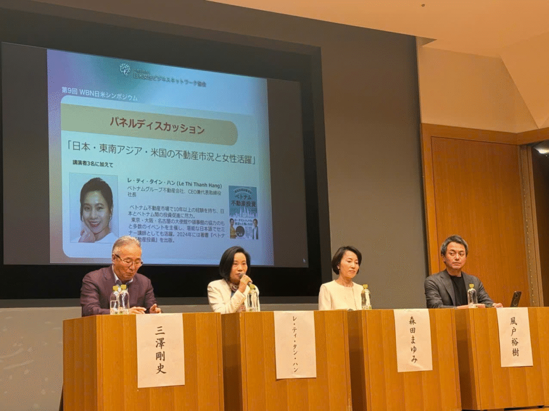 2025年11月21日、東京にて、ベトナムグルーブ不動産株式会社(VietnamGroove Real Estate JSC)を代表するCEO、レ・ティ・タイン・ハン氏が、Japan–U.S. Women’s Business Network Association主催の専門セミナー「日本・東南アジア・アメリカの不動産市況と女性の活躍」に特別ゲストとして登壇しました。