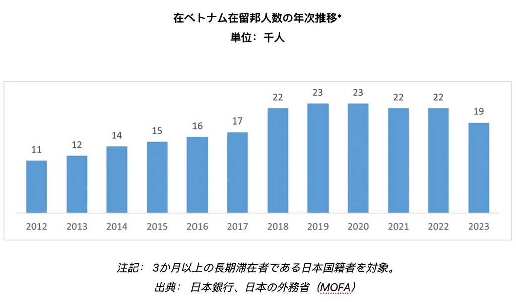 - 東南アジアでの位置づけ: 現在、ベトナムは東南アジアで第2位の規模を持つ日本人コミュニティです(タイに次ぎ、インドネシアとフィリピンを上回ります)。