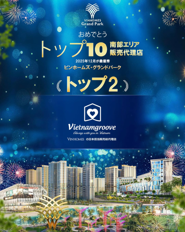 2025年12月、VietnamGrooveは、ベトナムを代表する大規模都市開発の一つである「ビンホームズ・グランドパーク」プロジェクトにおいて、優秀販売代理店 TOP2 に正式選出されました。本実績は、安定した販売成果、標準化されたコンサルティングプロセス、そして大規模な顧客対応力を有する代理店に対し、デベロッパーより直接評価された結果です。